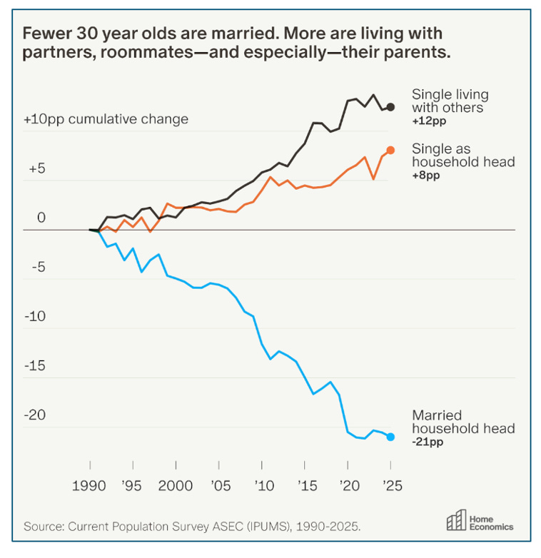 The share of American 30-year-olds living with their parents or roommates nearly doubled btw 1990 and 2025, from 17% to 32%. Aziz Sunderji finds that this group is largely responsible for the age cohort’s 15pp decline in homeownership over that period.