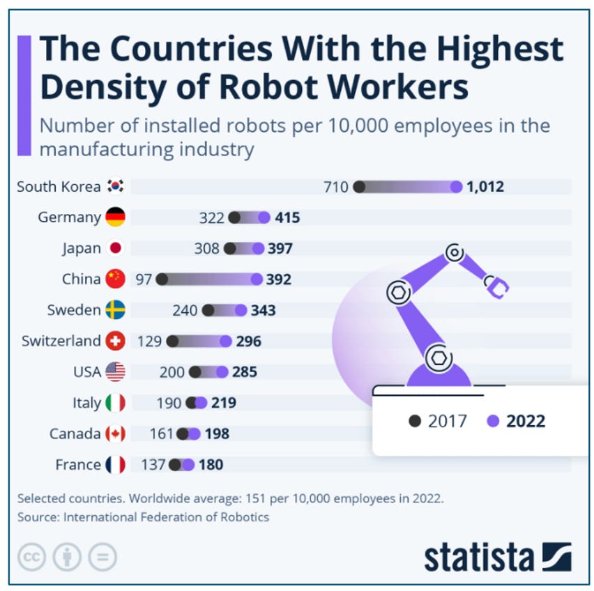 High US wages for skilled workers constrain robot adoption in manufacturing. “Many less productive US manufacturing firms could buy a robot, but couldn’t attract the talent to program it.” The US can’t “emulate” the low-wage, high-skilled China model.